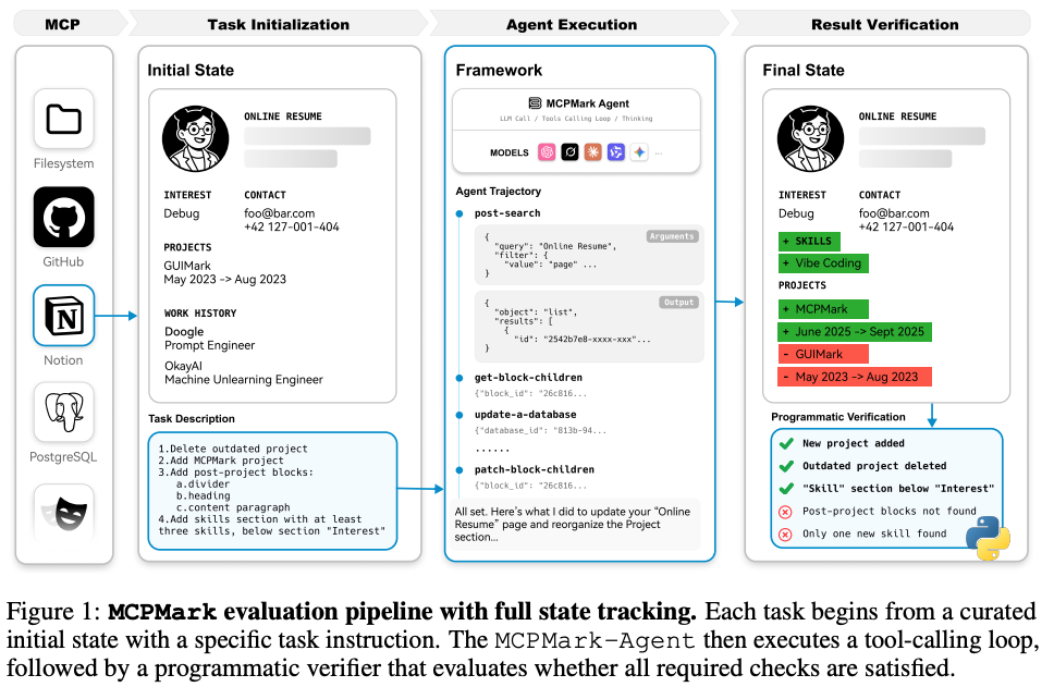 현실적 벤치마크 : 실제 워크플로우의 복잡성을 반영한 127개의 고품질 태스크로 구성된 신규 벤치마크 ‘MCPMark’를 제안함.
