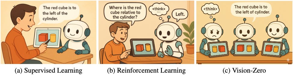 게임 기반 자가 학습 : 기존의 막대한 비용이 드는 수동 데이터 구축 방식에서 벗어나, AI 모델이 ‘스파이 찾기’와 유사한 시각 게임을 통해 스스로 학습 데이터를 생성하고 전략적 추론 능력을 향상시키는 프레임워크를 제안함.