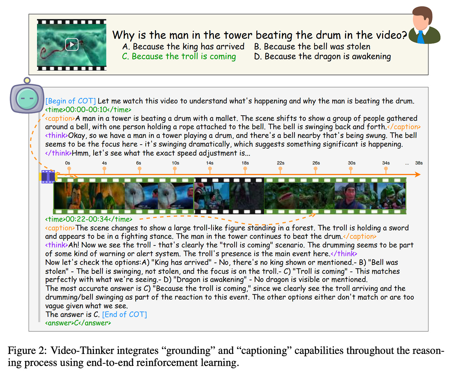 훈련 및 성능: 전용 데이터셋(Video-Thinker-10K)으로 SFT(형식 학습)와 강화학습(GRPO)을 거쳐, 외부 도구 없이도 7B 모델 중 최고 성능을 달성함.