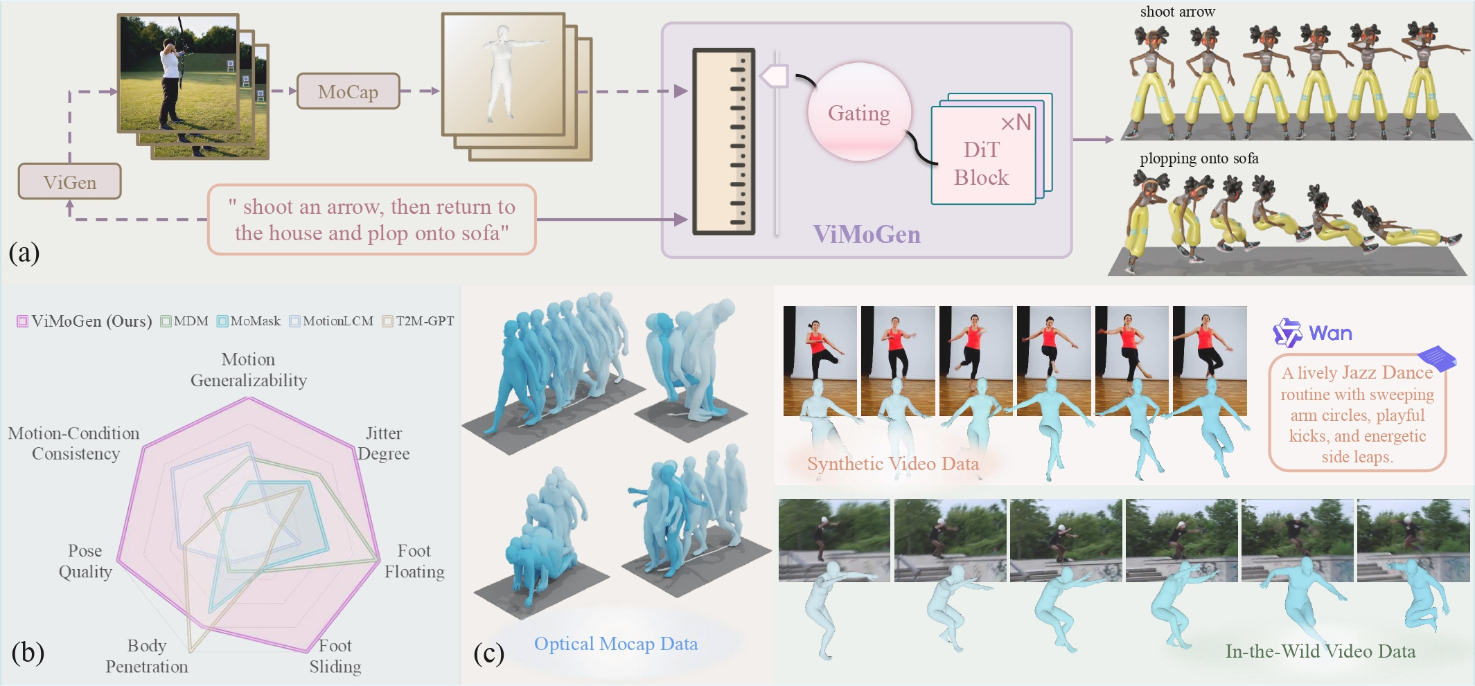 3가지 변화: 이를 위해 고품질 MoCap과 ViGen 데이터를 통합한 새 데이터셋(ViMoGen-228K), 두 지식을 융합한 새 모델(ViMoGen), 일반화 성능을 정밀하게 측정하는 새 벤치마크(MBench)를 모두 개발함.