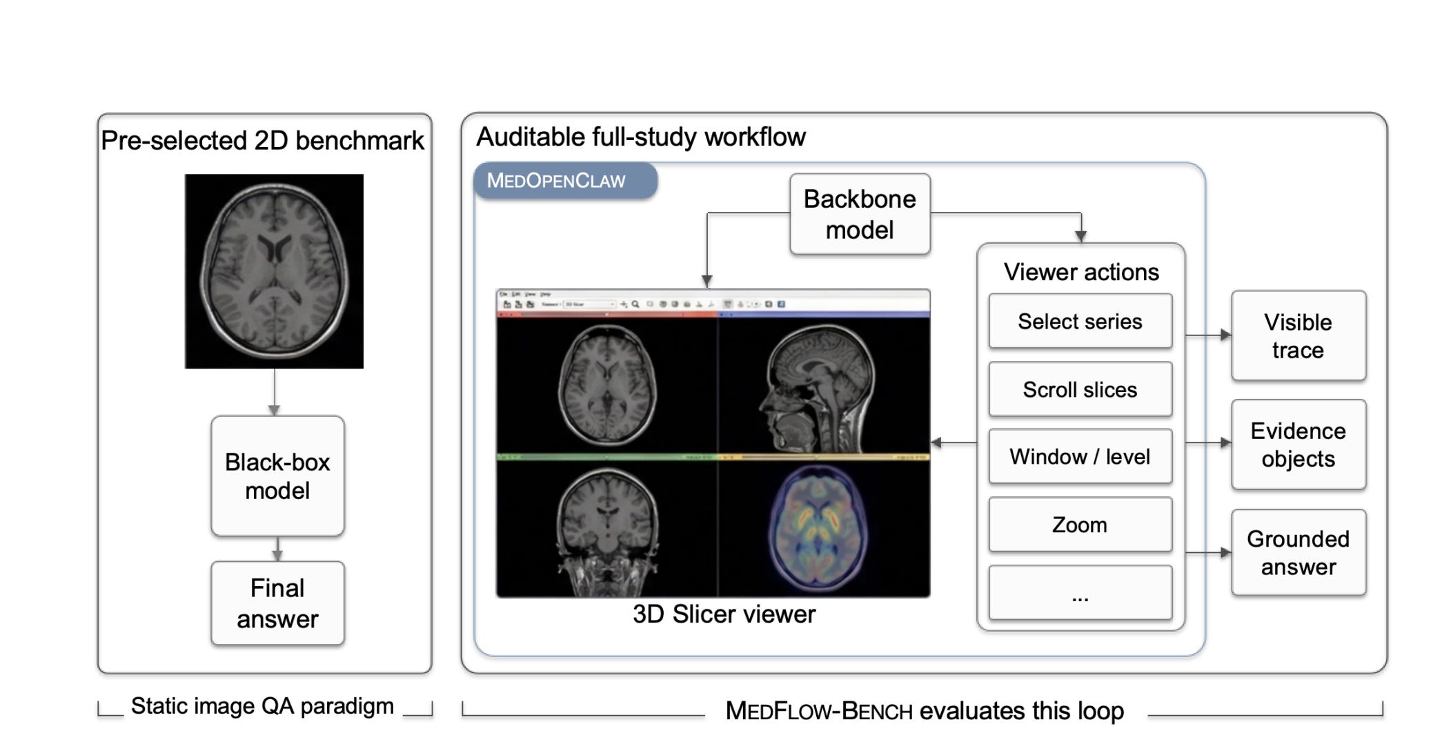 지능형 탐색 도입 : 의료용 뷰어를 직접 조작하며 3D 볼륨 데이터를 스스로 탐색하고 증거를 수집할 수 있는 동적 실행 환경을 제안함
