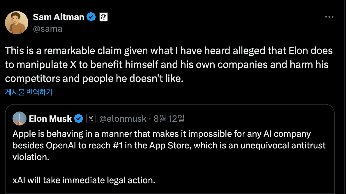 - 반독점 소송 제기 : 일론 머스크 의 xAI가 Apple과 OpenAI를 반경쟁적 담합 혐의로 소송을 제기함.