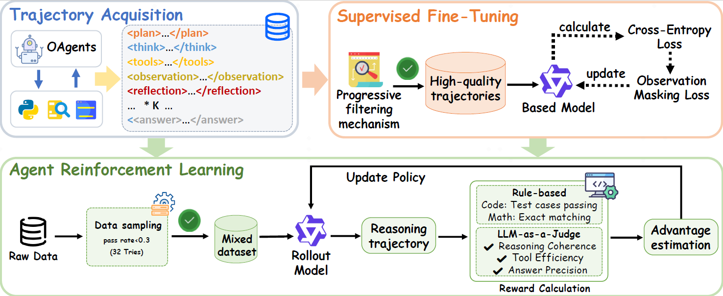 - 증류 및 강화학습 : 최신 다중 에이전트 시스템의 과정을 증류해 지도학습하고, 에이전트 강화학습(RL)으로 능력을 더욱 향상시키는 2단계 훈련 방식을 도입함.